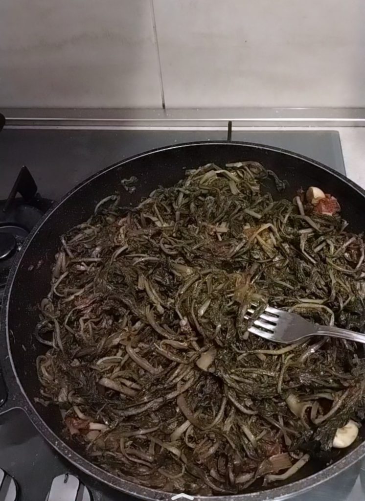 Het is tijd om de andijvie toe te voegen, laat je niet afschrikken als het te veel lijkt, tijdens het koken zal het krimpen.