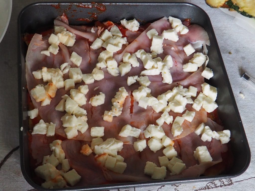 Ga verder met een laag ham en als laatste de in blokjes gesneden mozzarella.