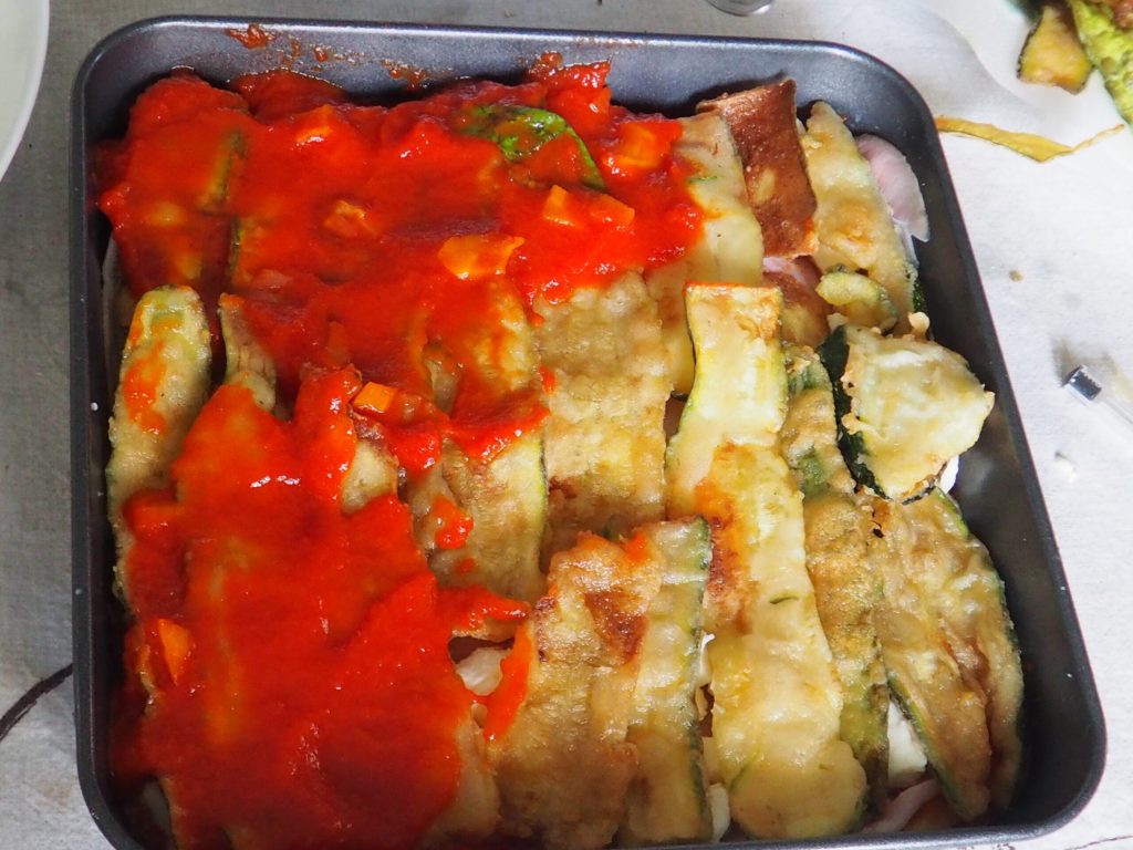 Bedek de bodem van een vierkante ovenschaal (20 cm zijde) met een beetje saus en leg er een laag gefrituurde courgetteplakjes op, gevolgd door nog een laag saus.