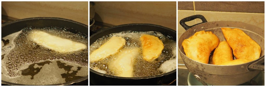 Om de temperatuur van de olie te controleren, doe een deegballetje erin, als het snel naar boven komt en binnen enkele seconden goudbruin wordt, is het klaar.