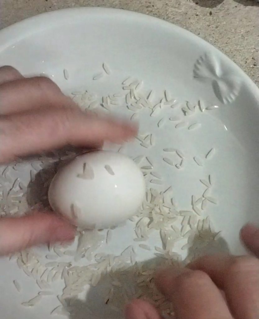 • Bedek het tweede rauwe ei met rijstkorrels.