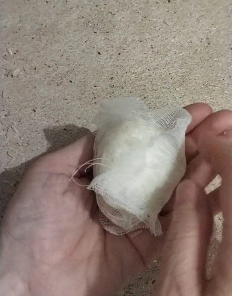 • Bevestig ze met een gaasje en wikkel het vervolgens in een nylon kous. Wikkel het laatste ei in een gaasje en bevestig het met een elastiek.