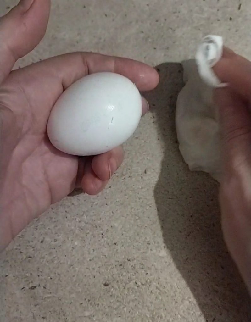 • Wikkel het eerste rauwe ei in een nylon kous.