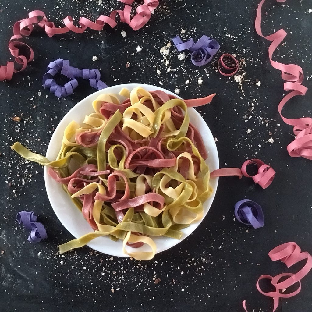 • Gebruik de pastamachine om de gekleurde tagliatelle te maken.