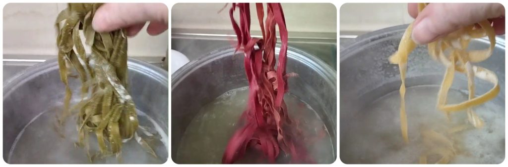 • Breng ruim water aan de kook in een pan, zout het wanneer het kookt en kook de tagliatelle. U kunt ze allemaal samen of per kleur koken (ik deed dit). Een paar minuten zijn voldoende. Schep ze eruit met een schuimspaan.
