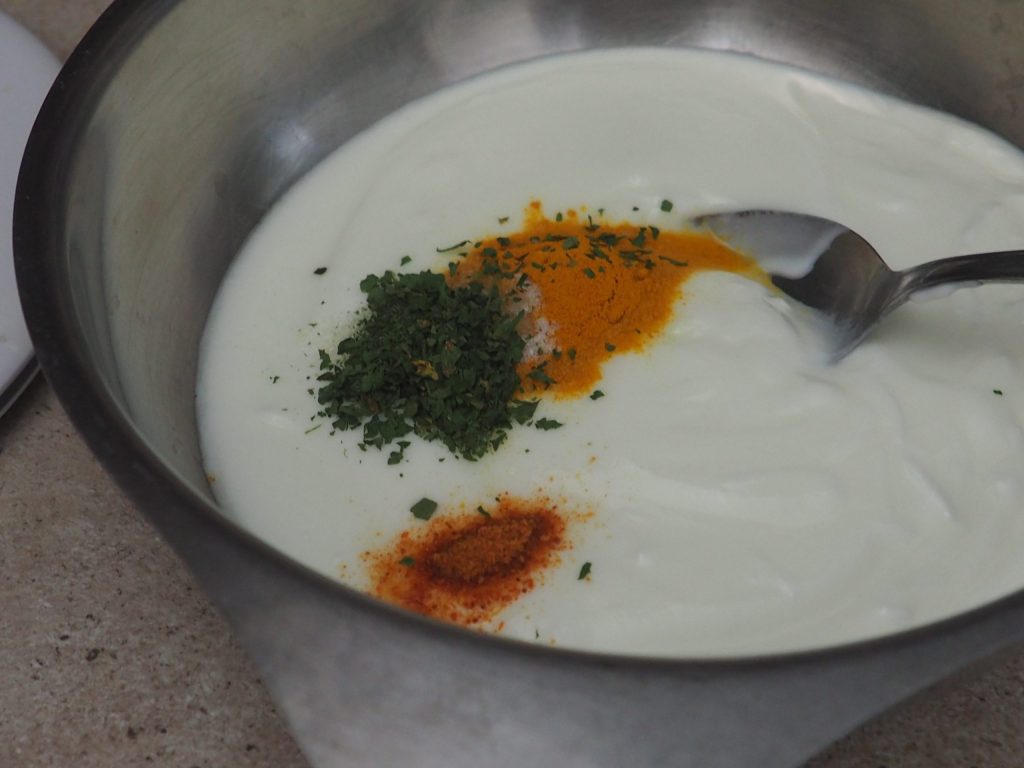 Doe de yoghurt in een kom, voeg de chilipeper, garam masala, kurkuma, zout en peterselie toe en meng.