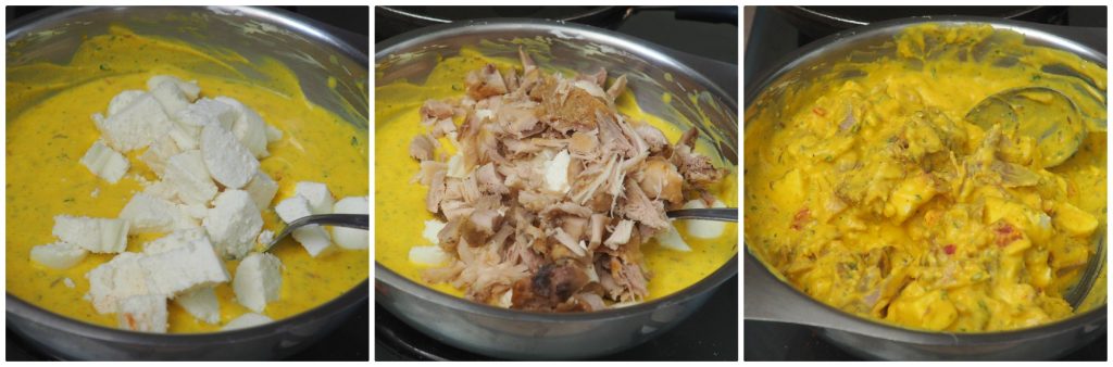 Voeg op dit punt de paneer en de kip toe aan het yoghurtmengsel.