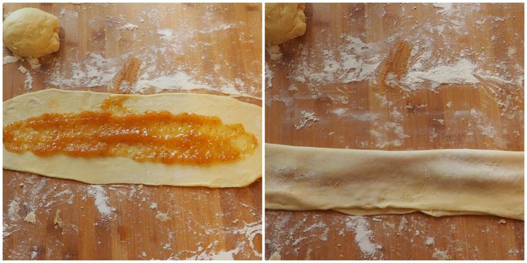 Vul het met twee theelepels jam en sluit het door de randen met een beetje water nat te maken (zoals op de foto hieronder).Vouw de strook dubbel (maak vochtig met een beetje water om beter te laten hechten) en draai hem ondersteboven (zie de foto’s hieronder).