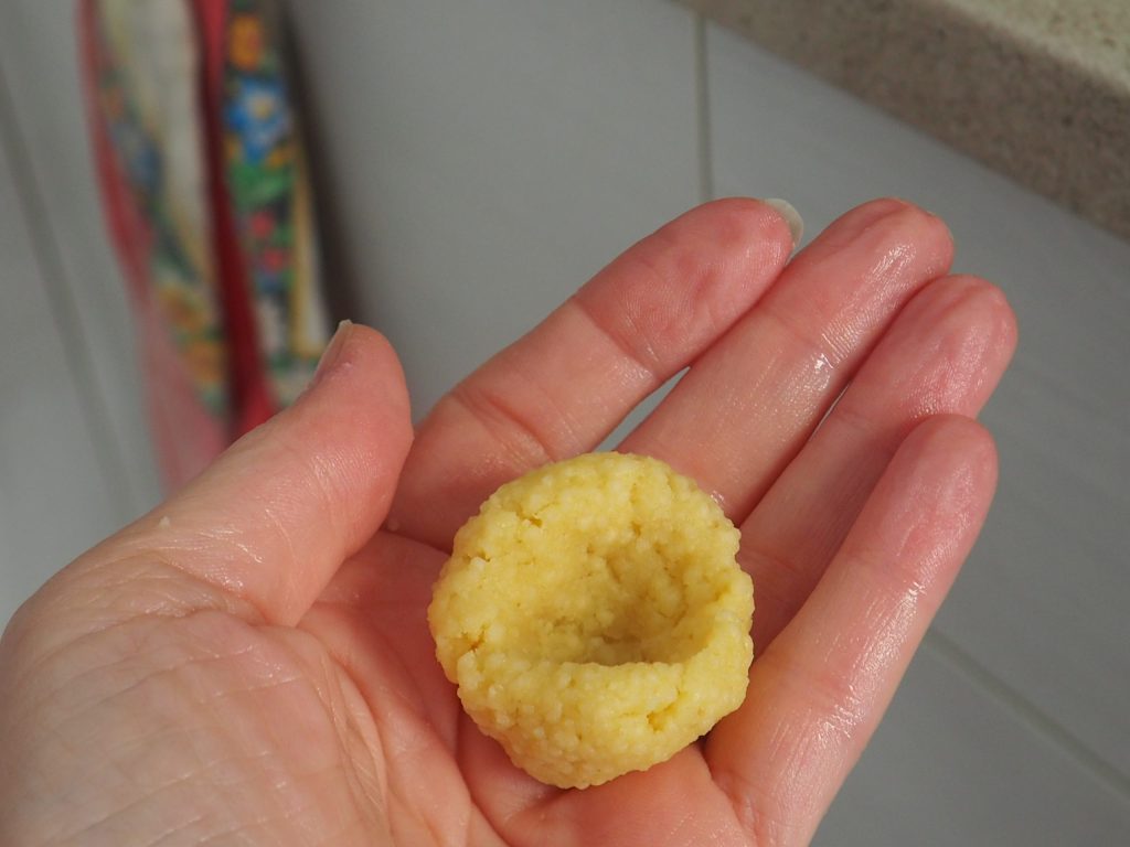 Maak met je duim een kuiltje in het balletje en vul het met wat kaas en een of twee blokjes spek. Sluit de gnocchi, druk het lichtjes plat met natte handen zodat het goed sluit. Rol het dan tussen je handpalmen, altijd nat. Probeer het samen te drukken om het geheel beter te compacteren.