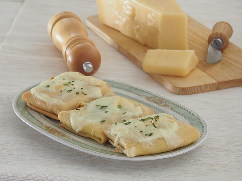 Crêpes uit de oven met ham, bresaola, courgette en emmentaler