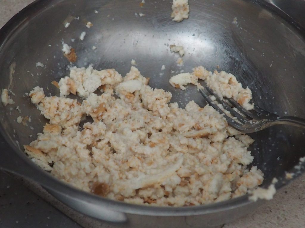 • Verkruimel met de handen het wit brood in een andere kom en voeg de melk toe.