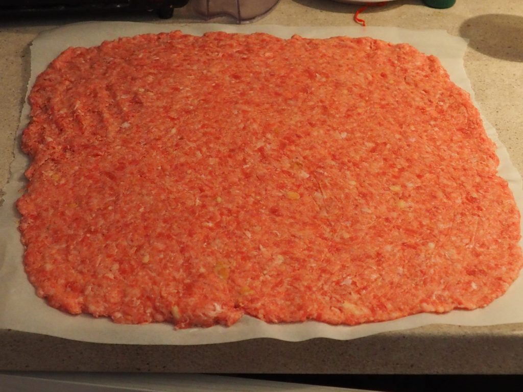 • Plaats het op een vel bakpapier, bedek het met een ander vel bakpapier en rol het uit met een deegroller tot een rechthoek van 35 cm breed en 37 cm lang.