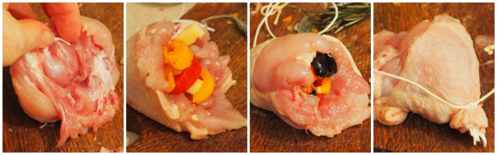 • Neem nu een ontbeende bout, vul deze met een paar stukjes paprika, anderhalve olijf, een in lucifers gesneden plakje kaas en sluit alles af met een braadkoord.