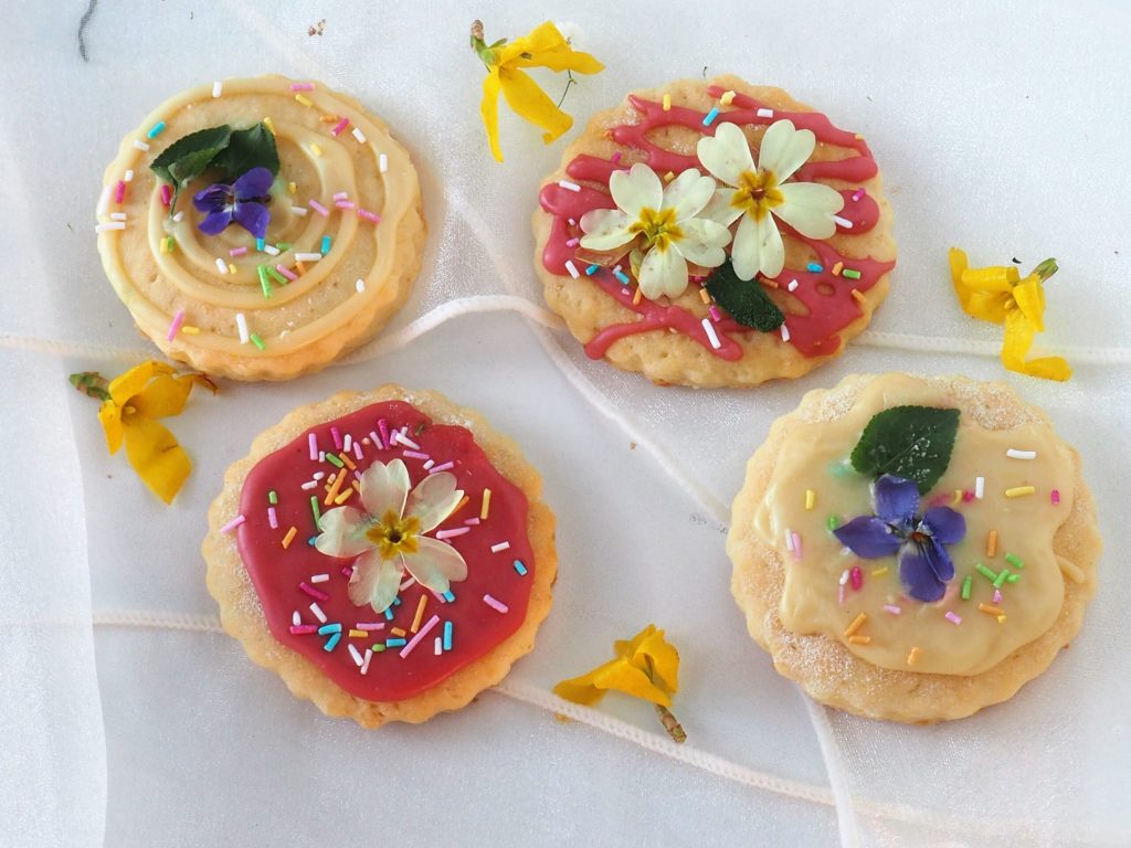 Bedek de licht afgekoelde koekjes met een beetje glazuur en plaats de bloemen erop (ik heb primula’s en viooltjes gebruikt). Om ze te bedekken kun je een spuit gebruiken of de glazuur direct met een theelepel aanbrengen, met de ontwerpen die je wilt.