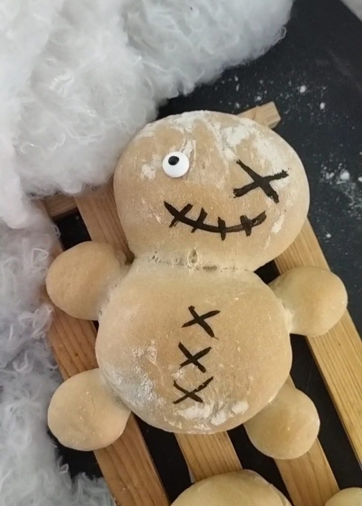 Voor Halloween vind ik het leuk om speciale recepten te maken, vooral om mijn kinderen en gasten te verrassen. Ik hou van recepten die enge, maar grappige personages voorstellen, dus ze moeten eng zijn, maar niet te veel. Voor dit jaar wilde ik heerlijke broodjes maken gevuld met ham en mozzarella, maar je kunt je uitleven en ze vullen met de vleeswaren en kazen die je verkiest, het is belangrijk dat de kaas niet te waterig is. Je kunt ze serveren als bijgerecht bij een hoofdgerecht of als aperitief, ze zijn heerlijk. In de Tips, aan het einde, kun je het recept met zuurdesem vinden.