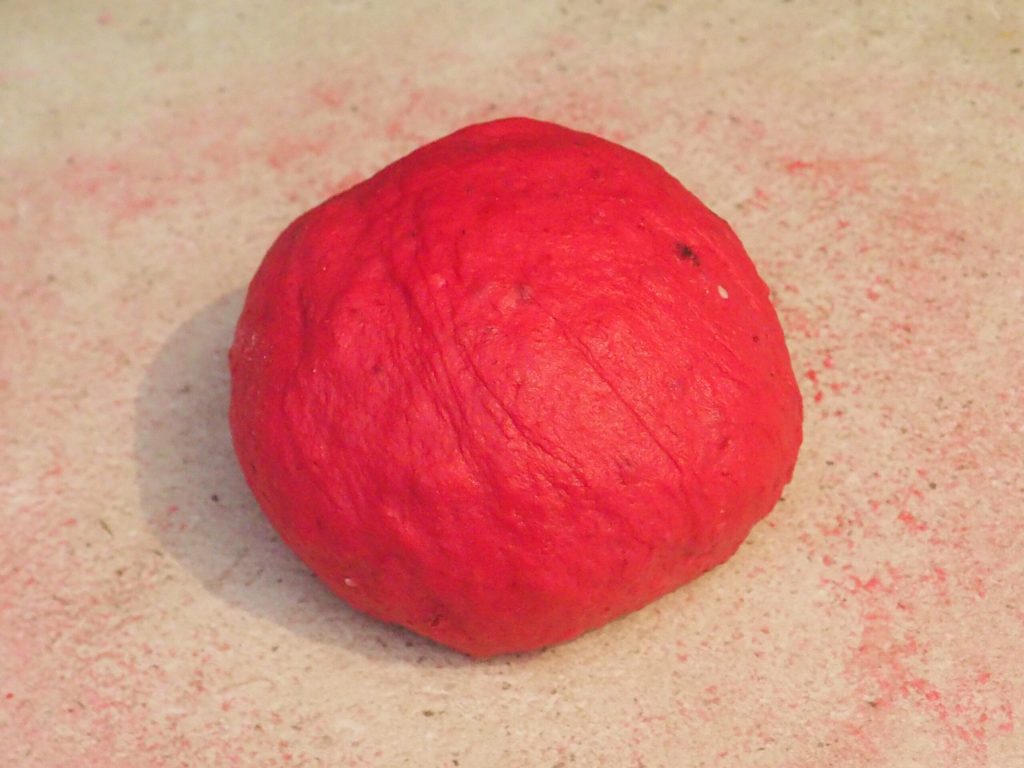 Leg de twee soorten meel, het ei, de geactiveerde gist, de suiker, de gemixte rode biet op een werkvlak en begin te kneden. Voeg als laatste het zout toe en kneed tot een glad en homogeen deeg.