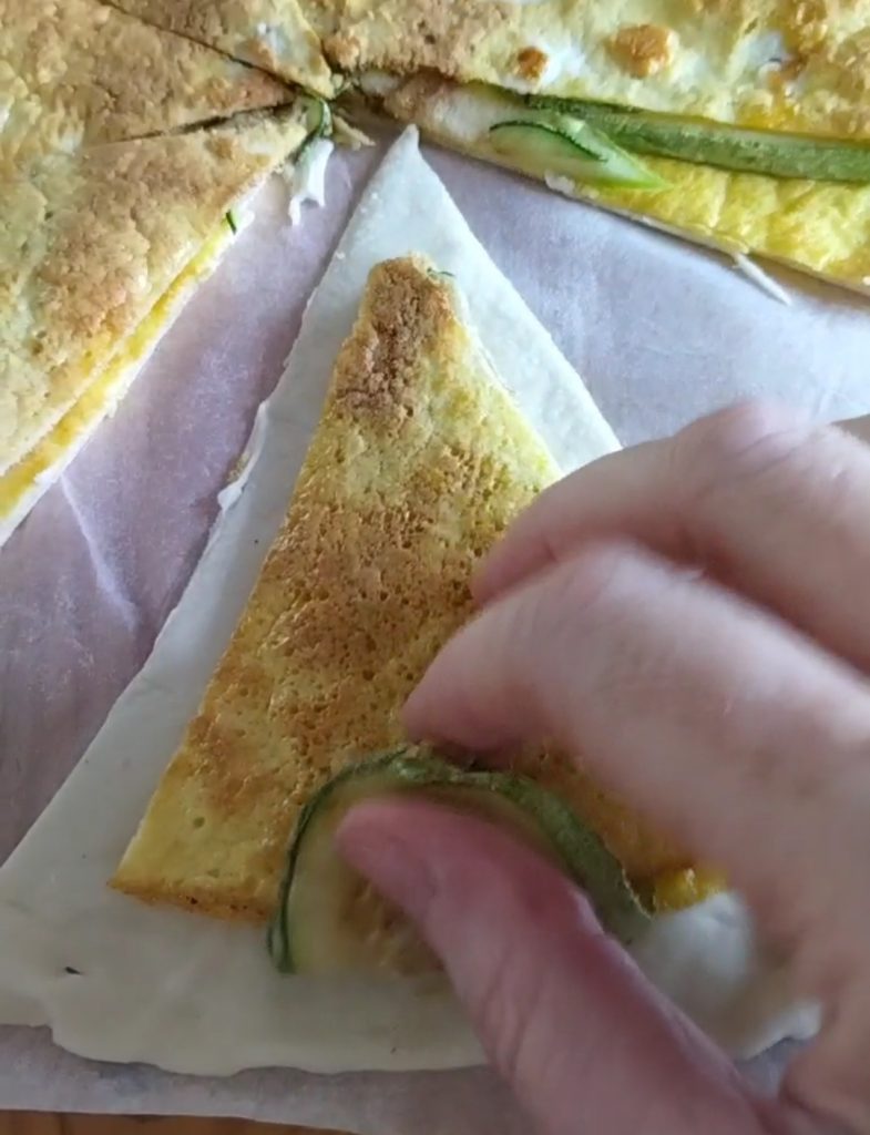 De Hartige croissants met omelet en gegrilde courgettes kun je ook met slechts één omelet bereiden, het zal gemakkelijker zijn om ze te rollen, maar wij houden van meer vulling.