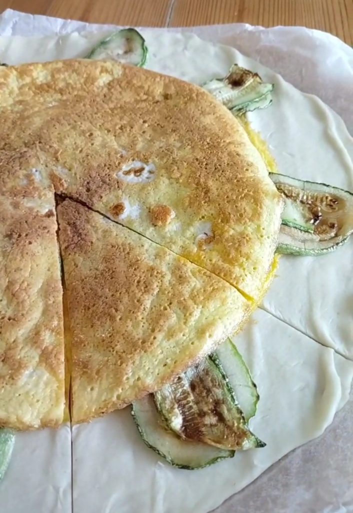 Rol nu het bladerdeeg uit, plaats de eerste omelet in het midden en leg er acht plakjes gegrilde courgette overheen zoals op de foto.