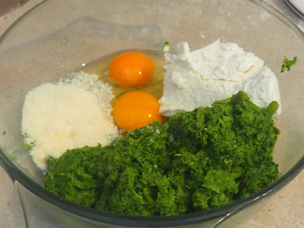Doe de broccoli in een kom, voeg de eieren, Parmezaan, ricotta toe en meng goed. Pas indien nodig het zout aan.