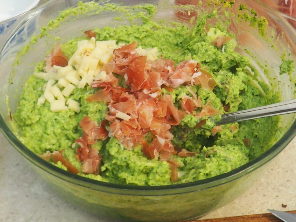 Snijd zowel de spek als de emmenthal in kleine stukjes en voeg ze toe aan het mengsel.