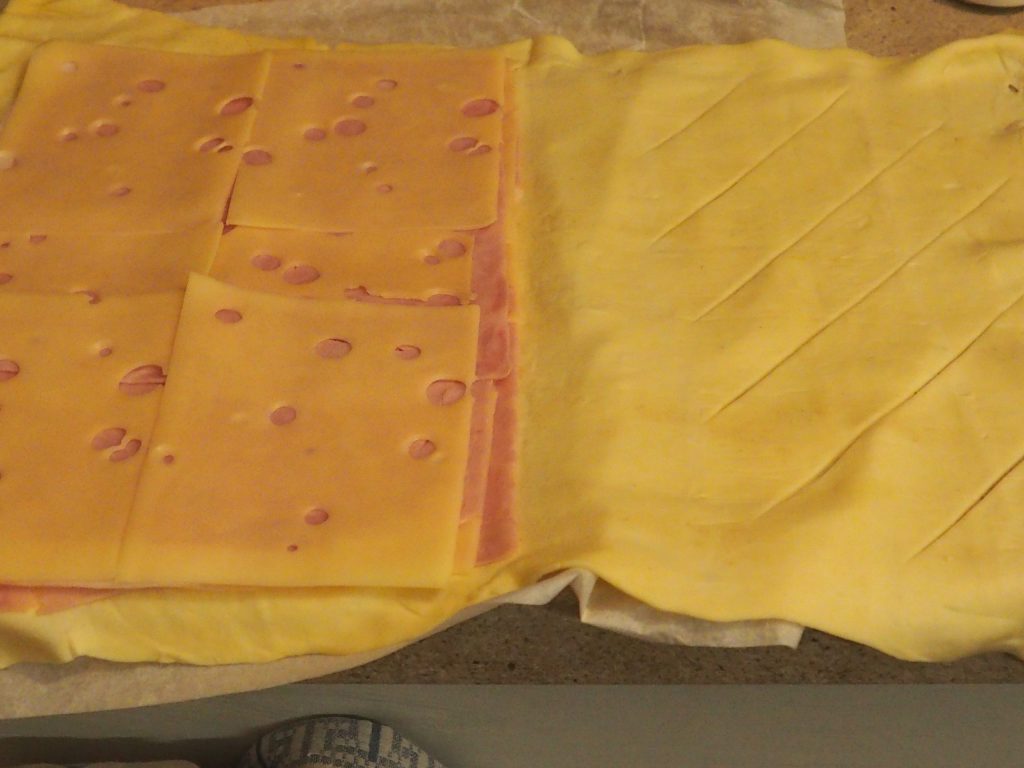 Rol het bladerdeeg uit en leg op de linkerhelft een laagje ham.