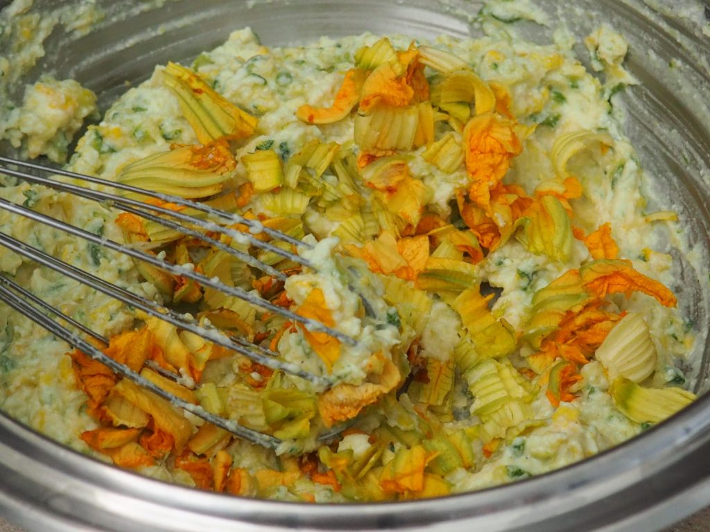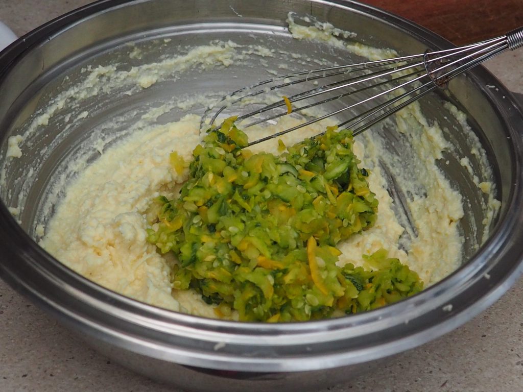 Knijp op dit punt de courgettes, die u heeft laten rusten, uit en voeg ze toe aan het eimengsel, roer met een garde of een lepel.