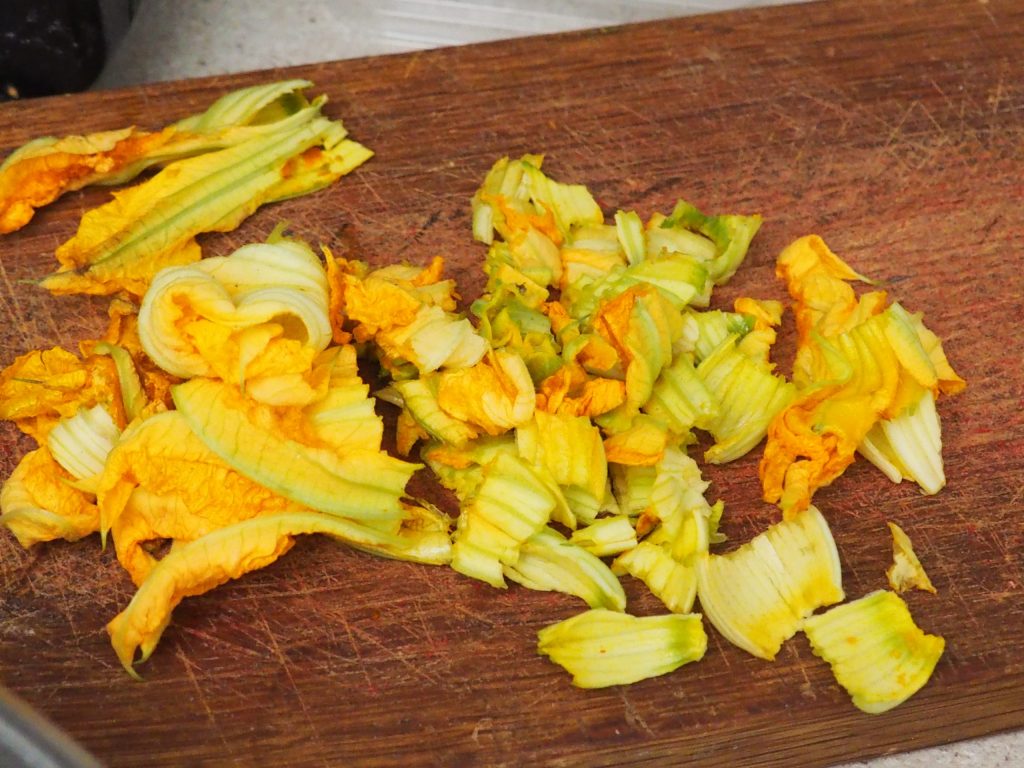 Voeg de pompoenbloemen toe en eventueel de in blokjes gesneden gekookte ham, dit is optioneel maar geeft extra smaak.