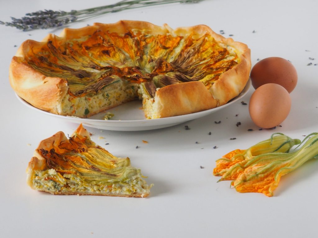 De Hartige taart met pompoenbloemen en courgettes is echt lekker om te proeven en mooi om te zien: het brengt de zon op tafel en de kleuren van vrolijkheid. Voor de smaakvollere versie, probeer ook 200 g gekookte ham toe te voegen, wij vonden het erg lekker.