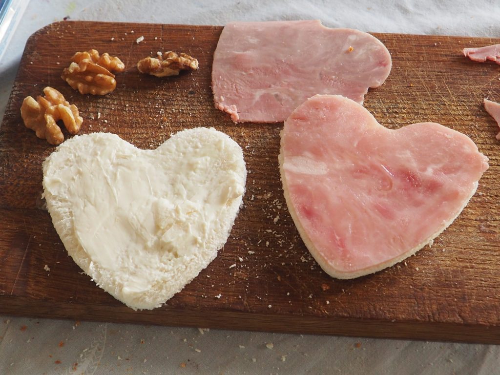• Smeer een of twee theelepels mascarpone en gorgonzola op een hart, strooi er de gehakte walnoot overheen, snijd met de vorm twee harten uit de plak ham en plaats deze op het witbroodhart.