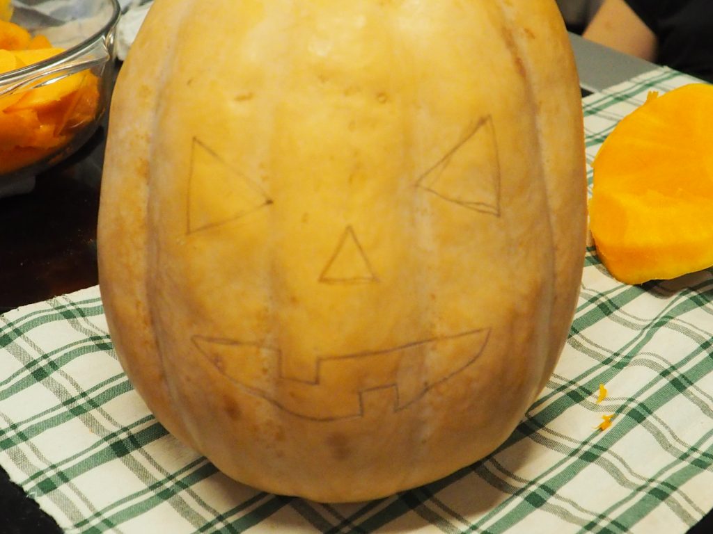 Ik heb de pompoen twee dagen voor Halloween klaargemaakt en bewaard in de koelkast tot aan het feest.