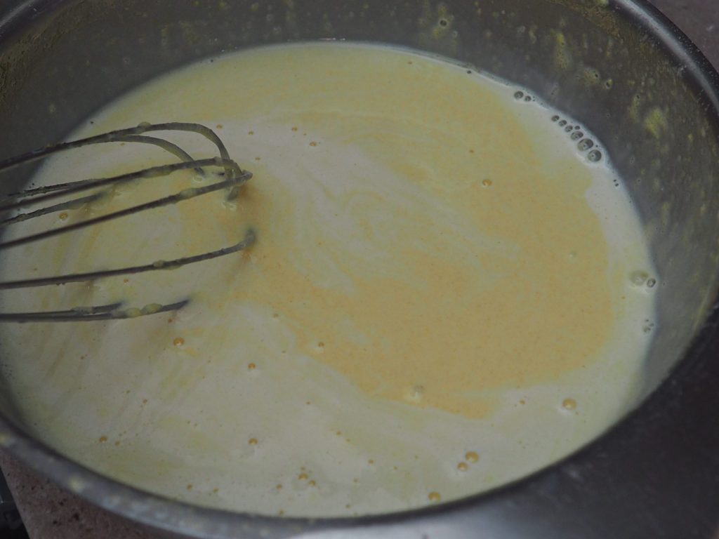 Giet de warme melk geleidelijk in het eier-suikermengsel, terwijl je blijft roeren met een garde.
