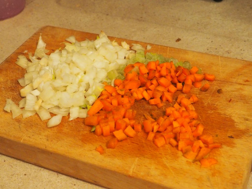 • Bak de gehakte ui, wortel en selderij in een beetje olie een paar minuten aan.