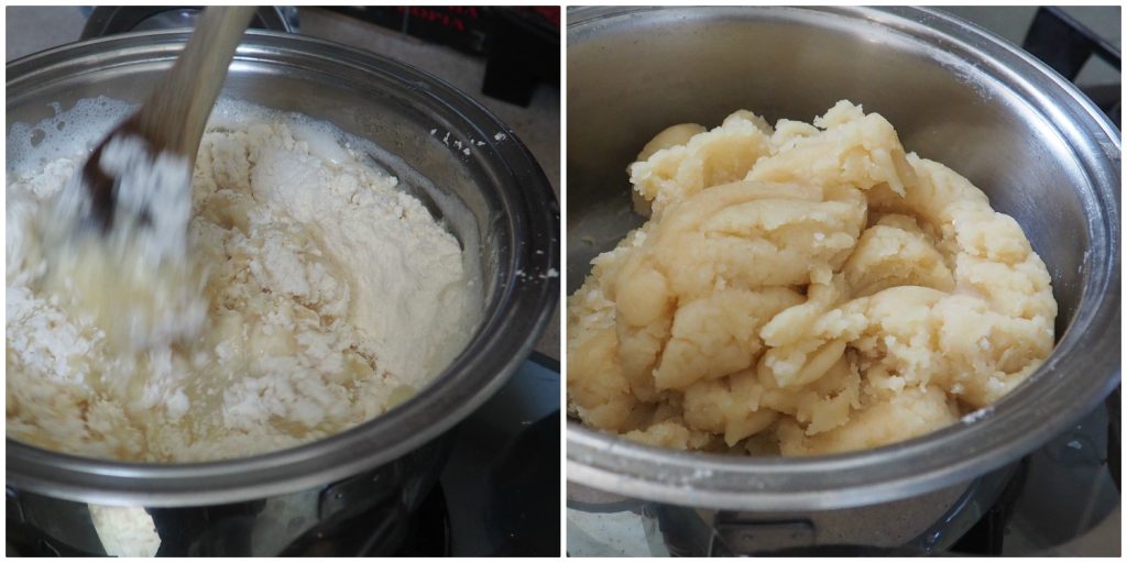 Zorg ervoor dat je de bloem in één keer in het water met de boter doet en roer totdat het volledig is opgenomen.
