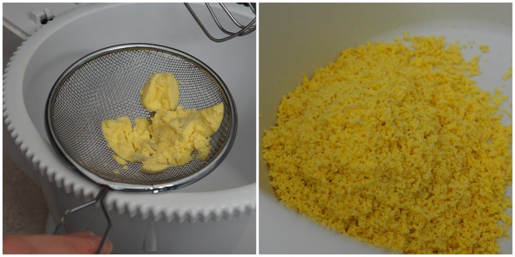 • Druk de eidooiers door een zeef zodat ze fijn worden en zich beter mengen met het deeg.