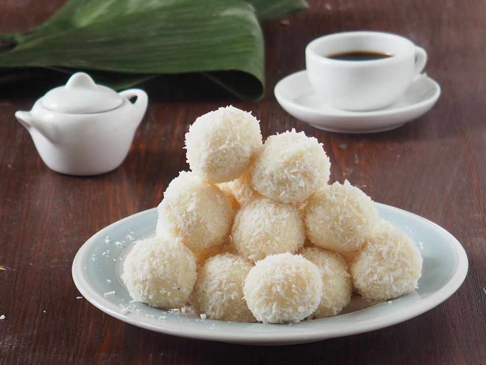 • Leg de balletjes in de geraspte kokos en rol ze zodat ze goed bedekt zijn.