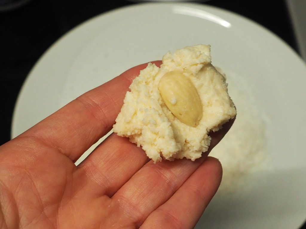 Plaats de amandel erop en bedek met een beetje mengsel.