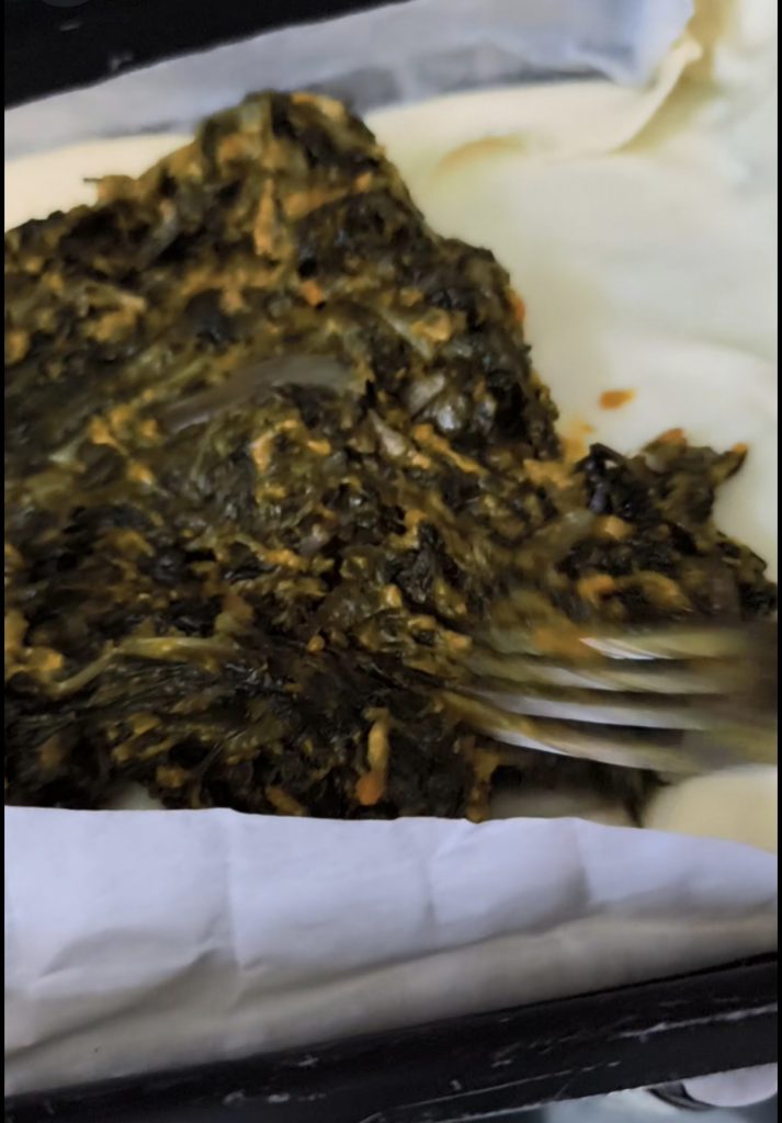 Laat het nu iets afkoelen. Bekleed vervolgens een rechthoekige bakvorm van 31×23 cm met bakpapier en leg daarop het eerste vel bladerdeeg. Schep de coste-vulling erin en strijk het zo gelijkmatig mogelijk uit.