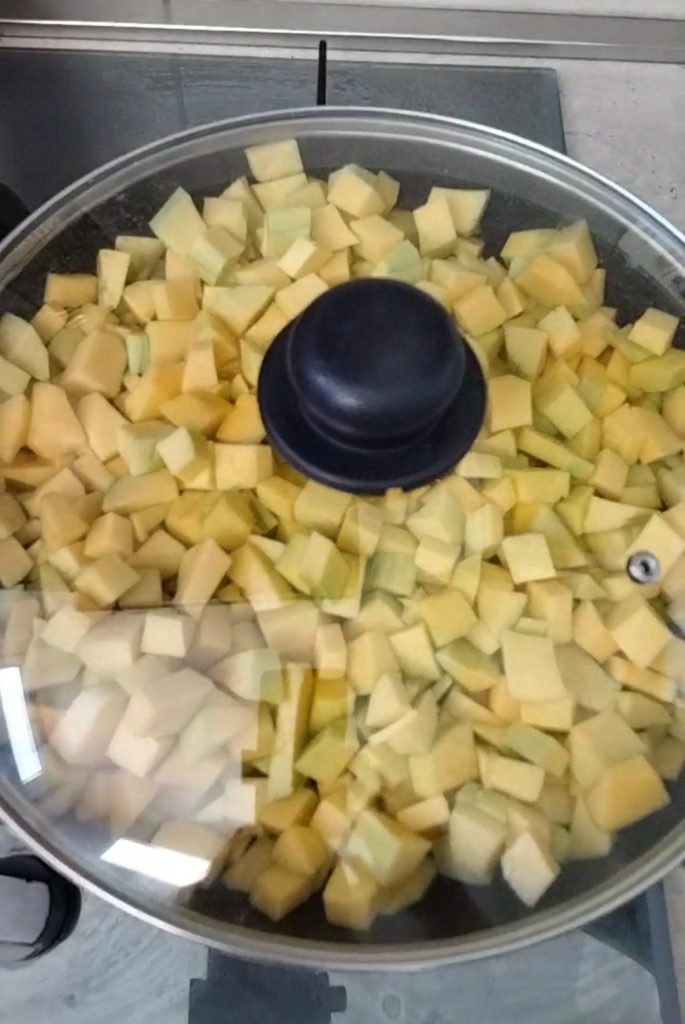 Snijd nu blokjes van de pompoen, doe een beetje olie in een grote koekenpan, voeg de pompoen toe en laat met deksel ongeveer twintig minuten koken.