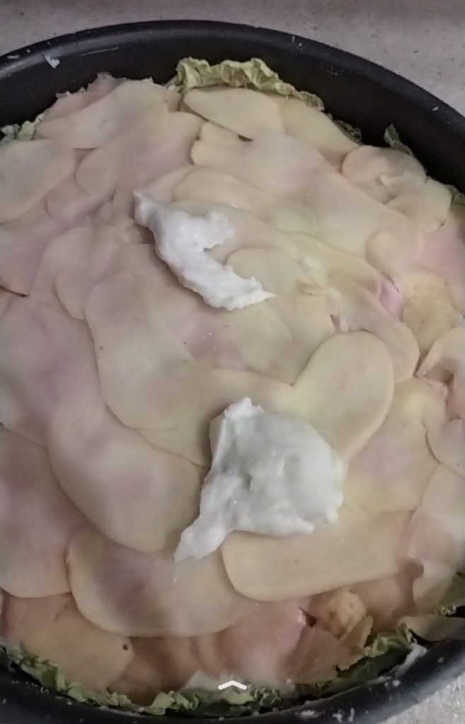 Maak het geheel af met een laagje dunne aardappelschijfjes, druk aan om het oppervlak gelijk te maken.