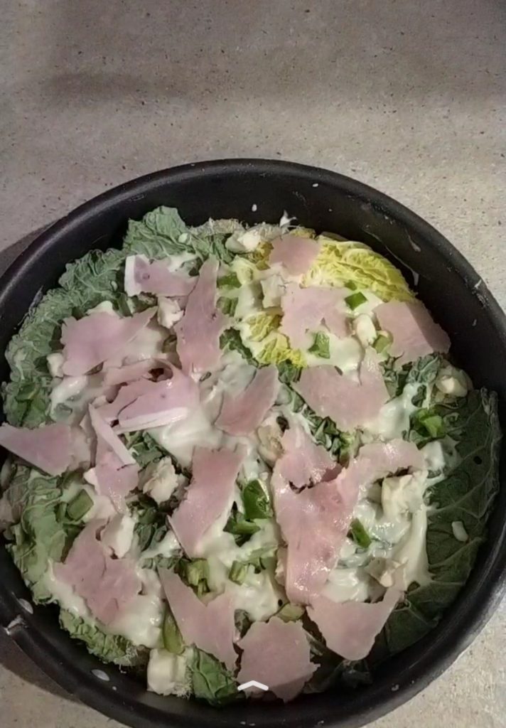 Nog een laag kool, bechamel, gekookte ham, kaas en Parmezaanse kaas.