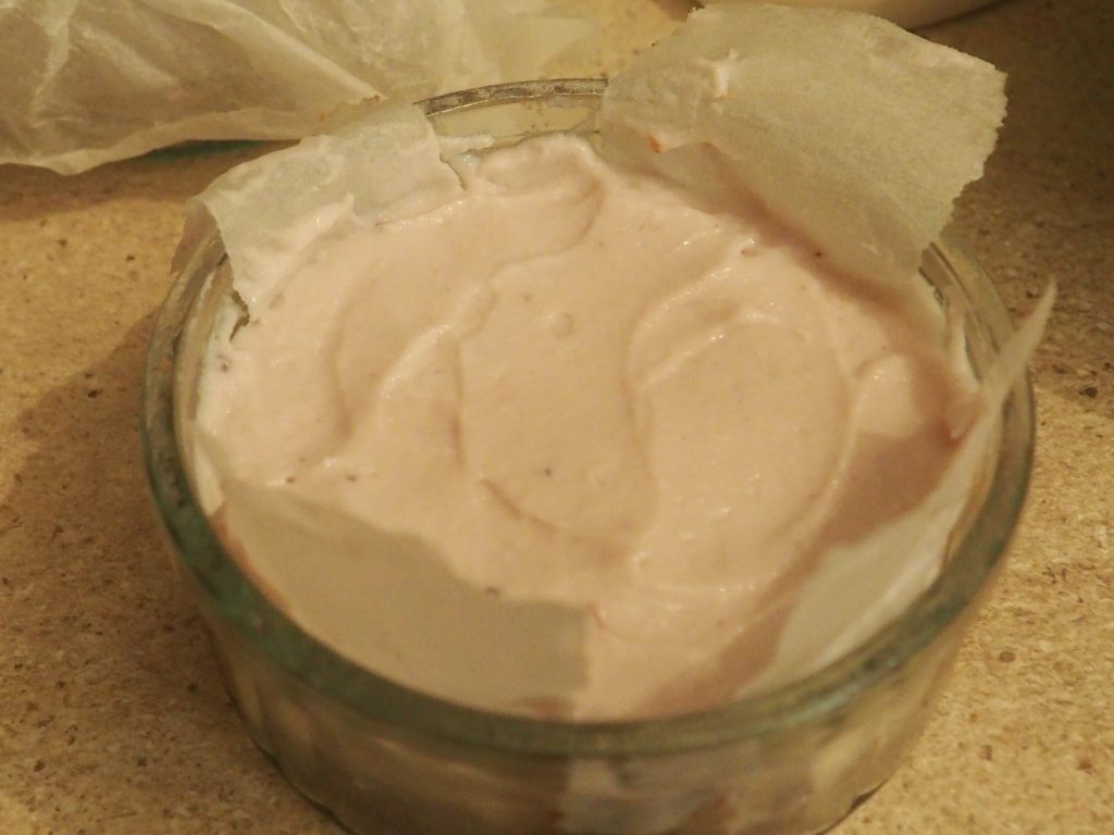 Week 6 g gelatine in een kom met koud water voor een paar minuten. Zet twee eetlepels room apart, de rest klop je stijf, voeg dan de yoghurt toe terwijl je blijft kloppen, daarna de mascarpone en als laatste de poedersuiker. Doe de gereserveerde room in een glas, verwarm het enkele seconden in de magnetron, knijp de gelatine uit en laat het oplossen in de room, voeg het toe aan het mengsel en mix nog enkele seconden. Doe het mengsel op de koekjesbodems en probeer het glad te strijken. Zet het minstens twee uur in de koelkast om op te stijven.