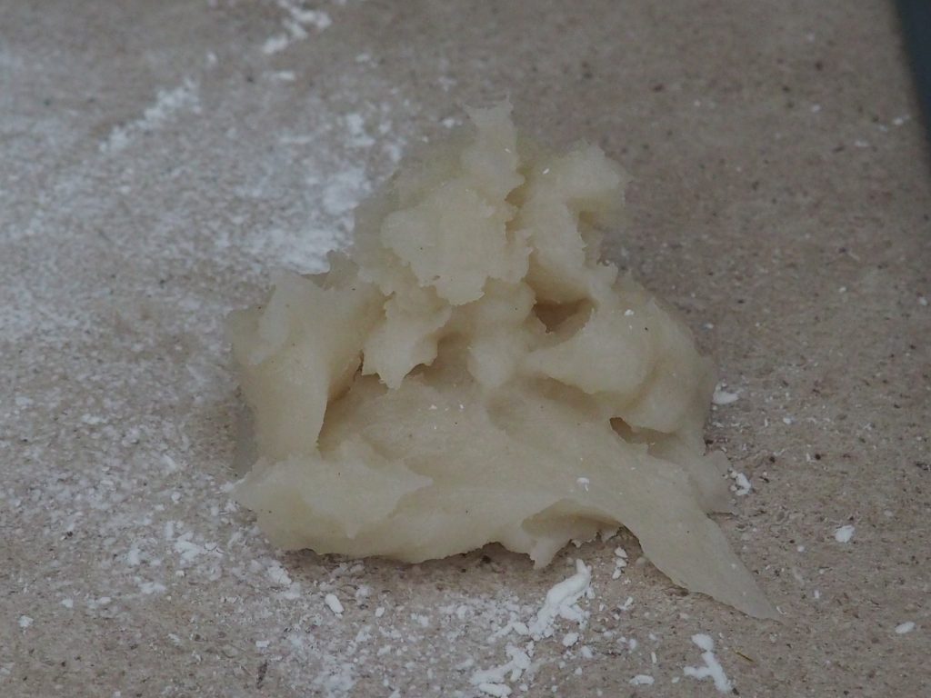 Het rijstmeelmengsel moet altijd met met maïszetmeel bestoven handen worden bewerkt, omdat het erg plakkerig is.