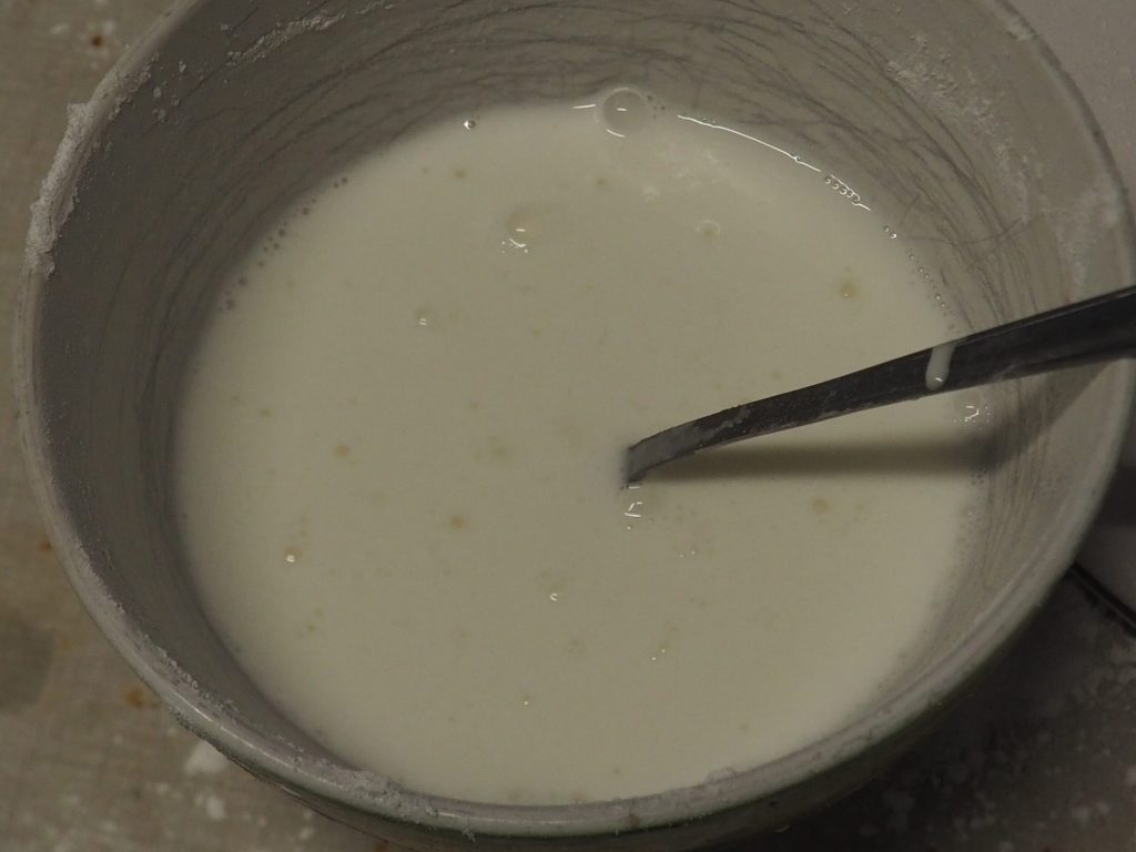 Doe het meel en de suiker in een kom en meng het. Voeg dan beetje bij beetje het water toe en meng de ingrediënten goed.