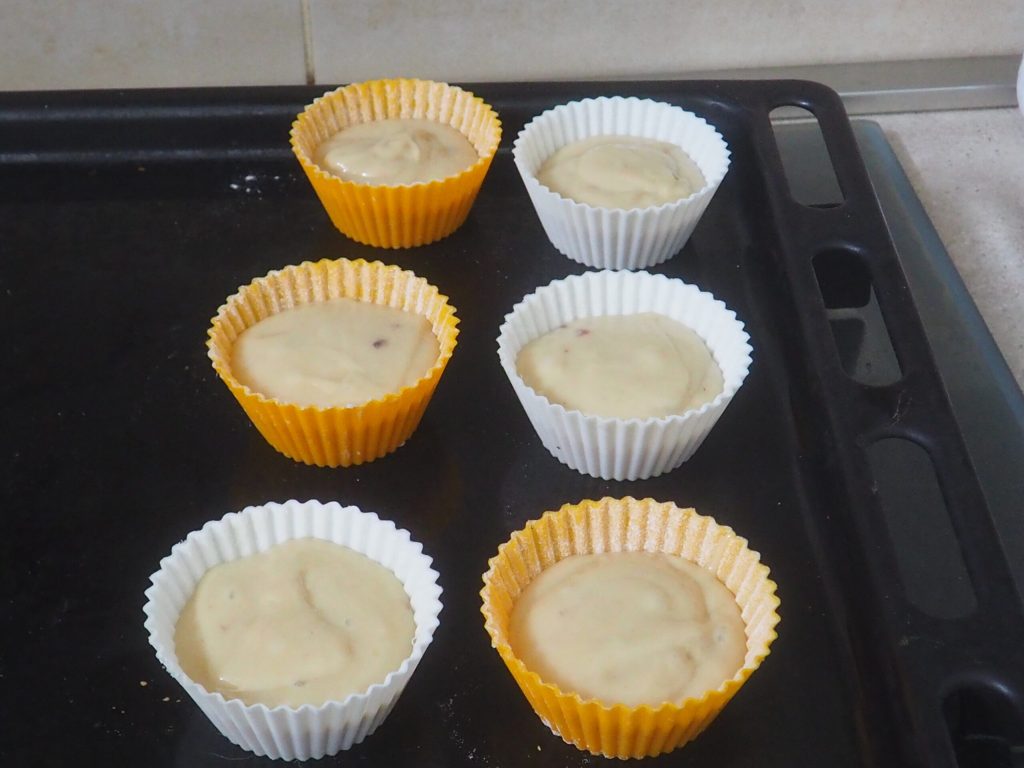 • Plaats de eerder ingevette en bestoven vormpjes op de bakplaat en vul ze voor ongeveer de helft. Als je vormpjes gebruikt met een hoogte van 3,5 cm en een diameter van 6,5 cm, krijg je er 6/7 uit. Bak ongeveer 20 minuten op 180° op de tweede plank van onderen.
