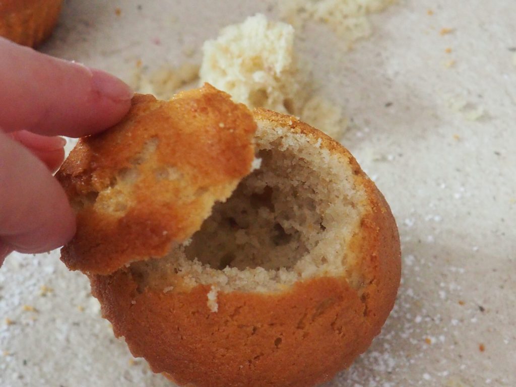 Snijd de kapjes van de muffins met een mes, haal het binnenste eruit met een theelepel.