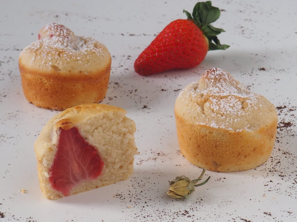 Deze muffins met aardbeienhart zijn echt heerlijk: zacht en luchtig, met een heerlijke verrassing erin: een hele aardbei in het midden. Probeer ze en hap na hap zullen ze je zeker veroveren. Bovendien zijn ze glutenvrij en zonder boter.