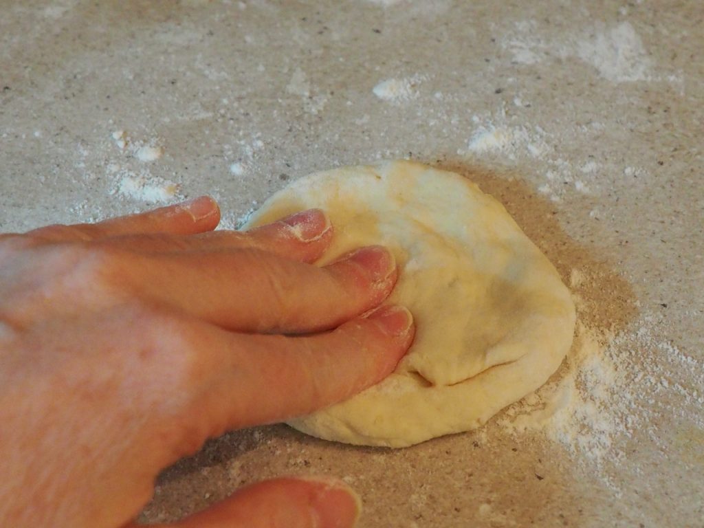 • Bestuif een werkblad met bloem, neem een van de acht stukken, druk het plat met de vingers en plaats het op het werkblad.