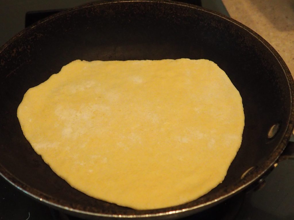 Let op, zodra je het deeg in de pan legt, laat het een of twee seconden liggen, draai het om voordat zich bubbels vormen, je kunt de eerste keer ook deksel weglaten. Dek het daarna af en laat het een paar minuten koken. Draai het meerdere keren om totdat het gaar is.