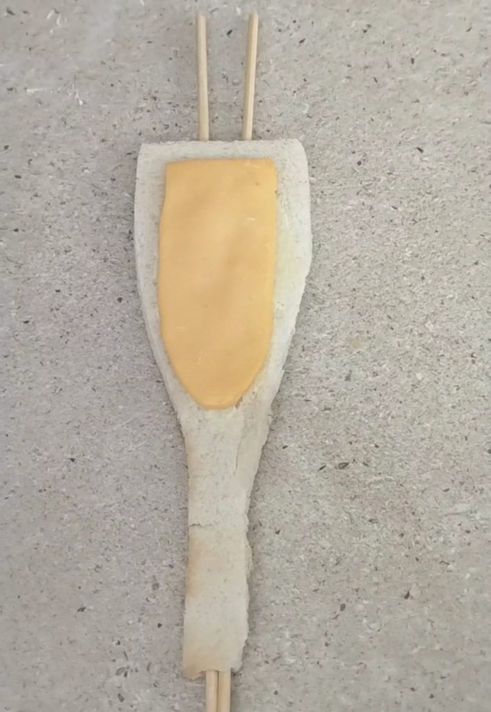 Doe hetzelfde op het plakje smeltkaas en knip de vorm van de vloeistof uit. Met één plakje smeltkaas heb ik twee vormen verkregen.