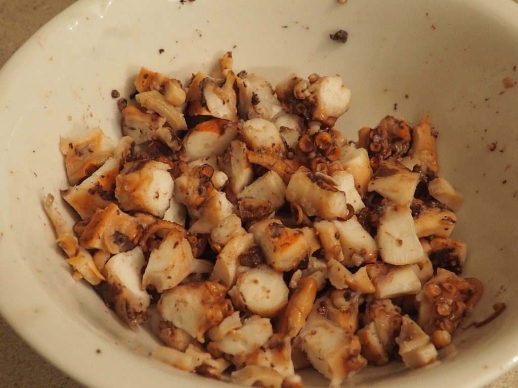 Snijd de octopus nu in stukjes, voeg ze toe aan de aardappelen en voeg indien nodig nog wat olie en zout toe.